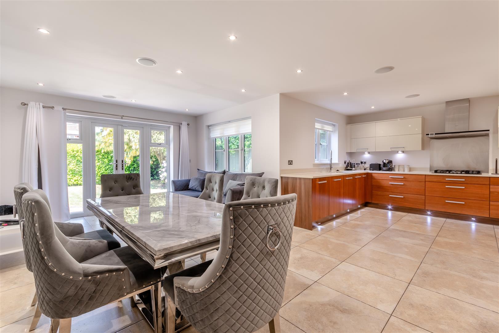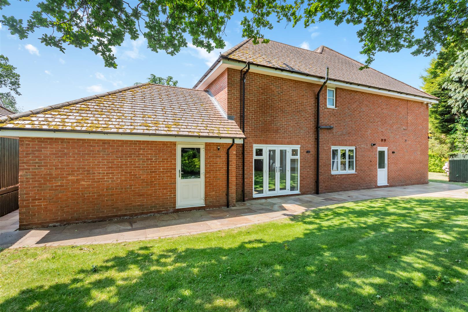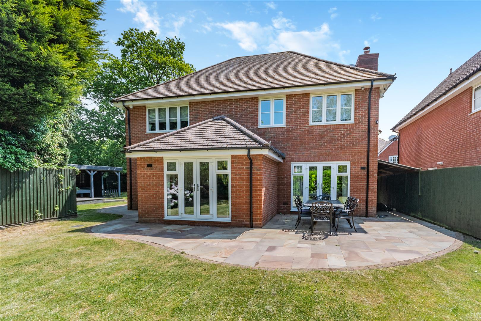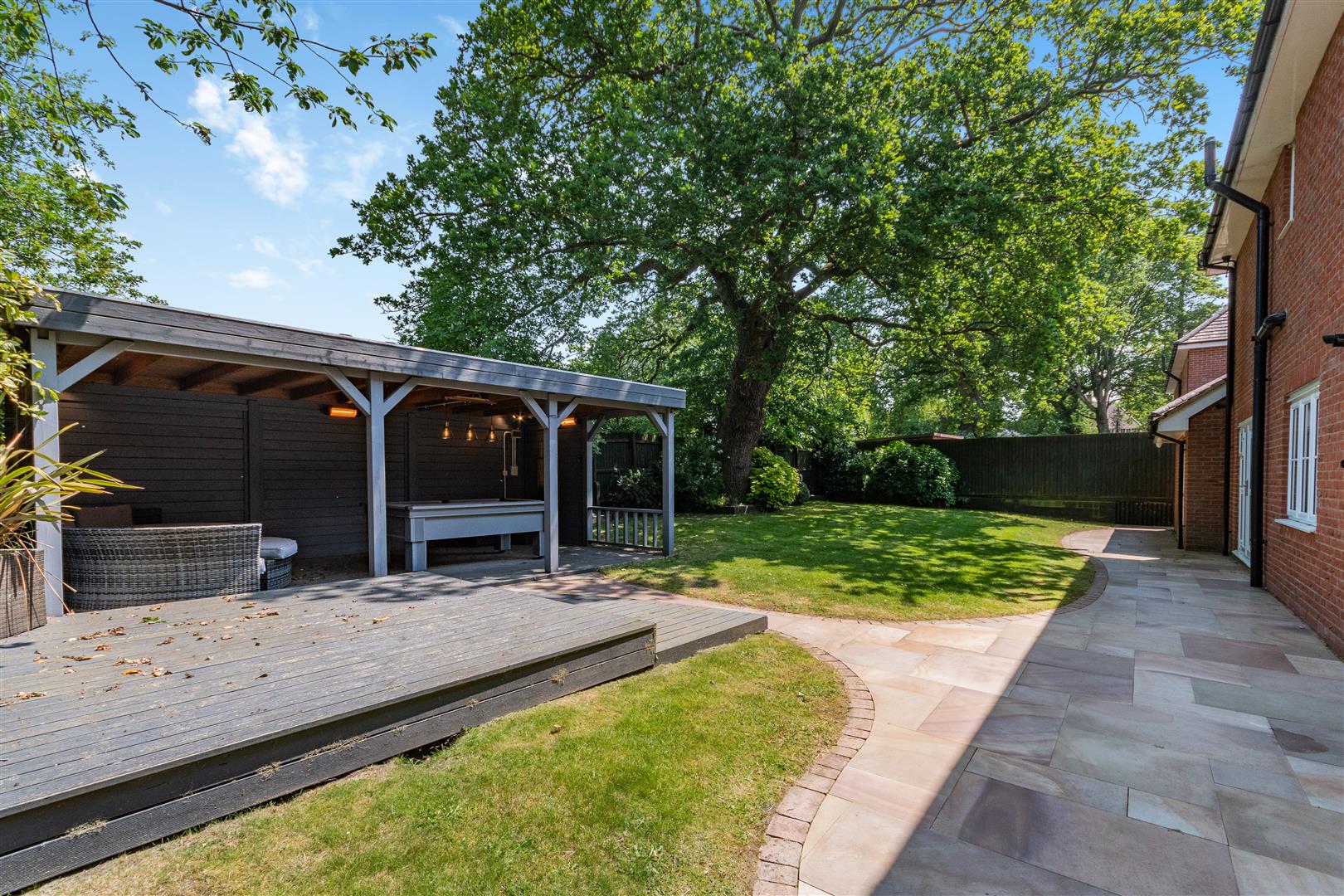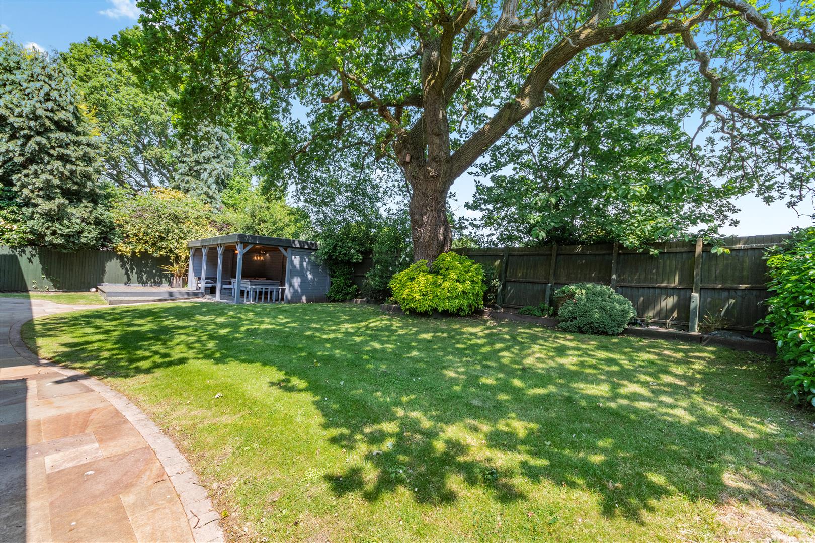 Stone Paved driveway, Double integral garage, Outdoor covered entertaining area, Stone paved patios, Wooden Decking area, Walled private garden, Lawned areas, Mature trees and shrubs