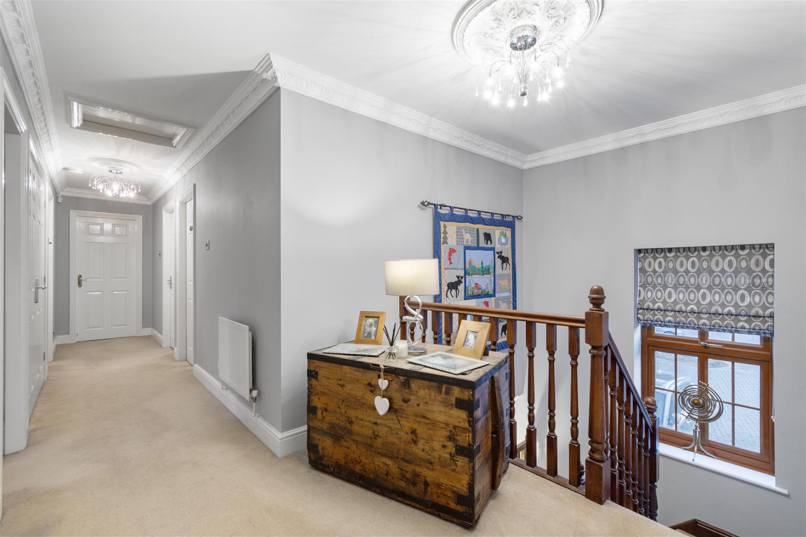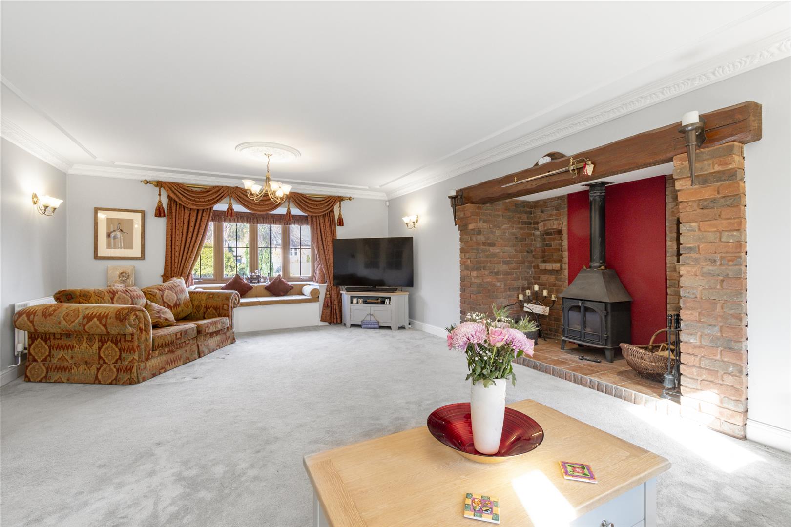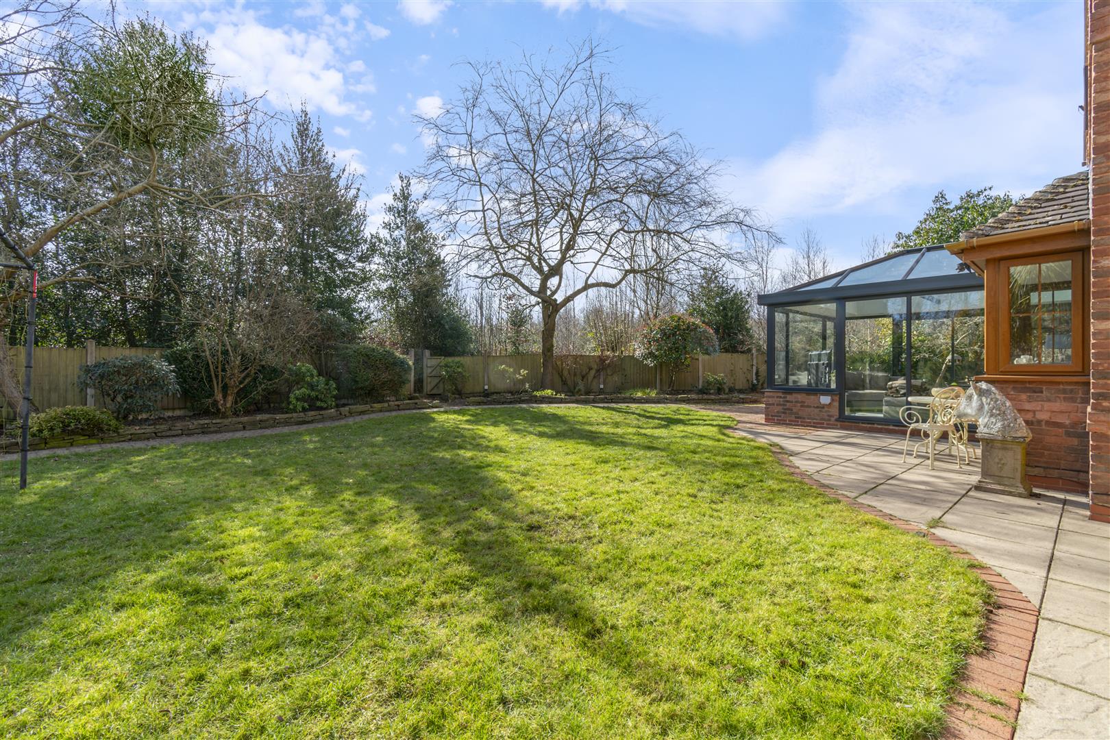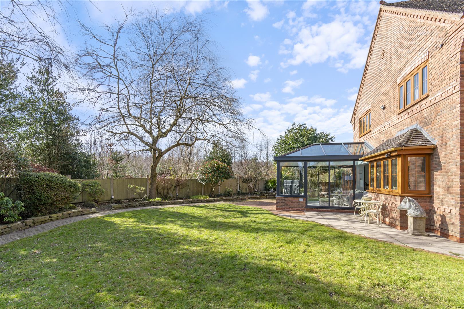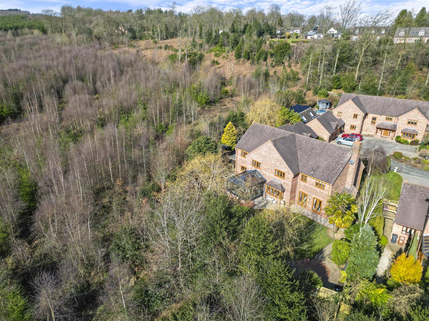 Perfect for entertaining, the landscaped gardens include a paved terrace, outdoor bar, and kitchen. Upstairs, the galleried landing leads to five generous bedrooms, three with en-suites, including a luxurious principal suite. A study, utility room, and triple garage complete this exceptional home backing directly onto Cannock Chase woodland.