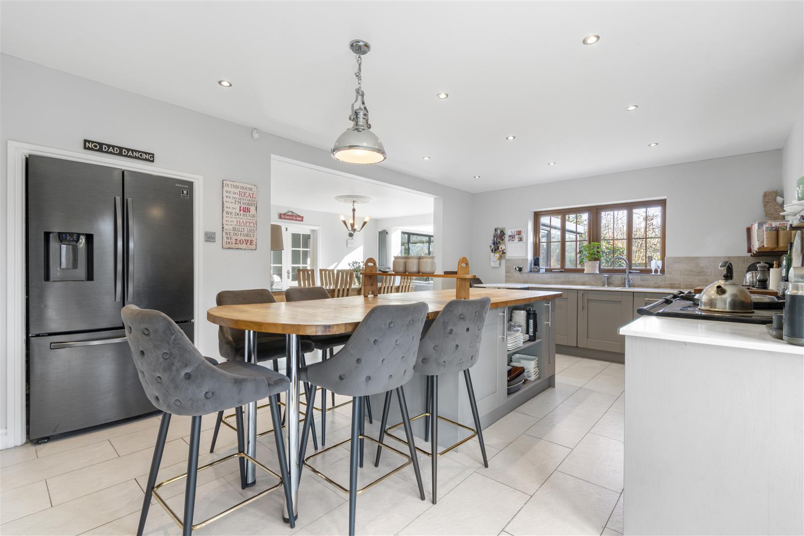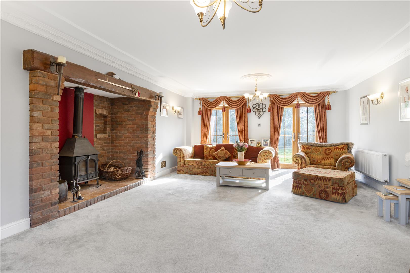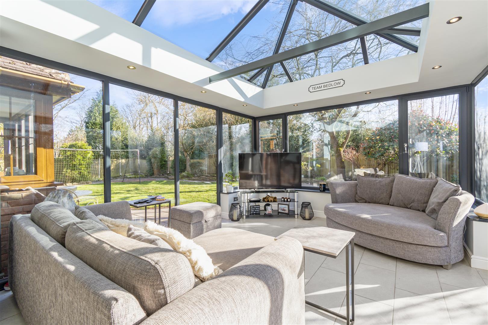 The stylish drawing room with Inglenook fireplace and French doors opens to the garden, while the spacious games room connects seamlessly to the open-plan kitchen, dining, and family area. The bespoke kitchen features a large island, six-oven Aga, and flows into a stunning orangery with vaulted glass roof and garden views.