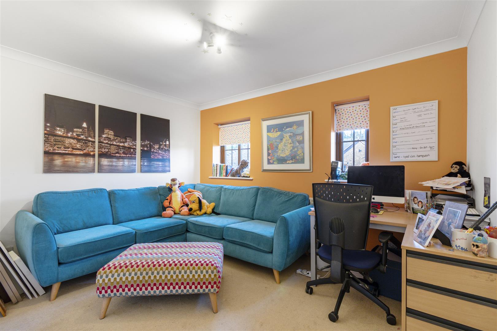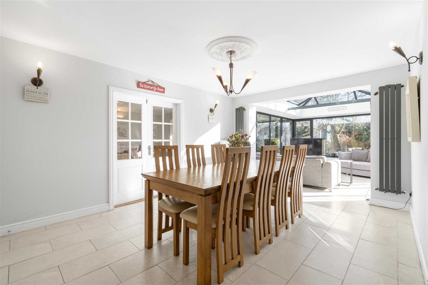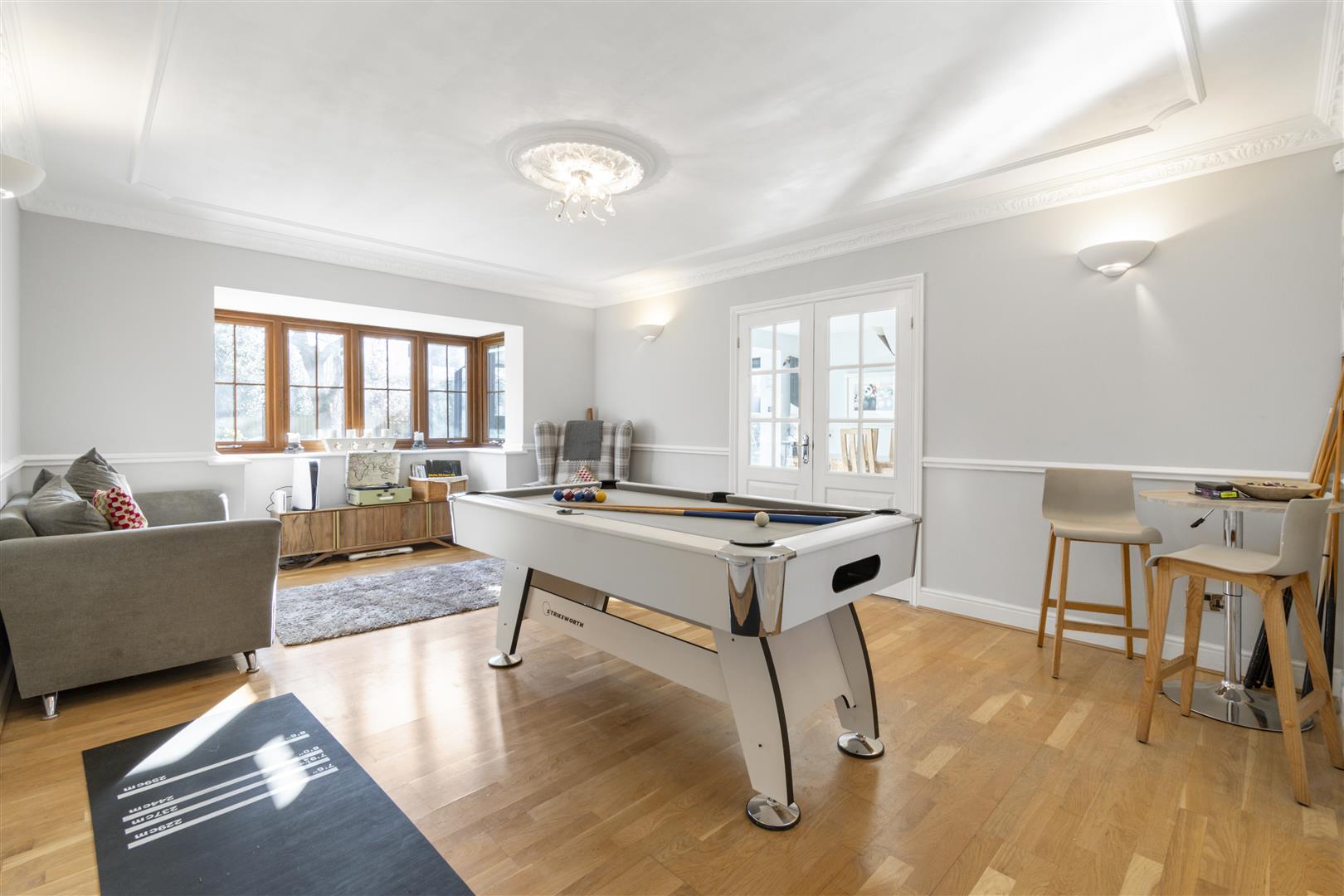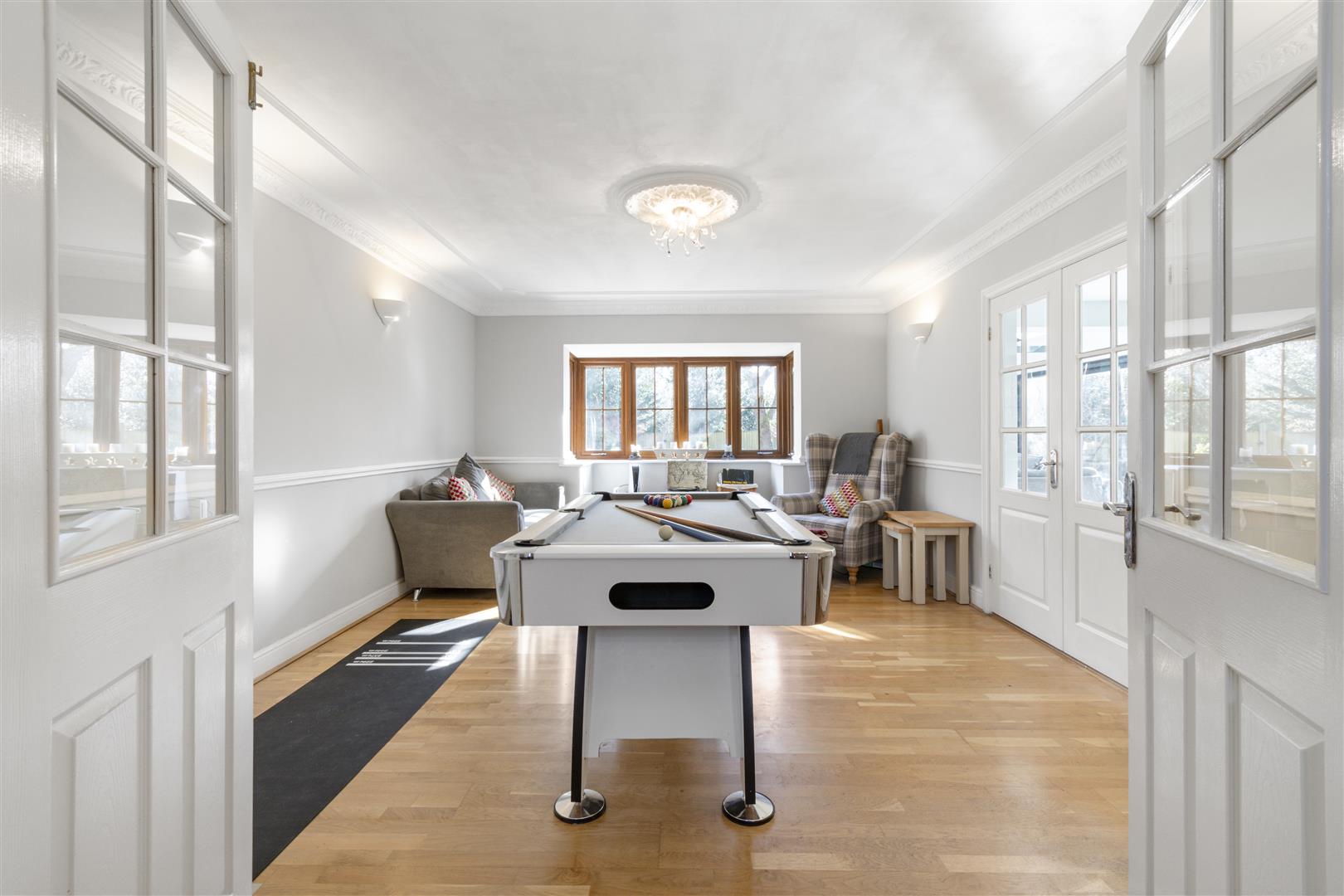 The stylish drawing room with Inglenook fireplace and French doors opens to the garden, while the spacious games room connects seamlessly to the open-plan kitchen, dining, and family area. The bespoke kitchen features a large island, six-oven Aga, and flows into a stunning orangery with vaulted glass roof and garden views.