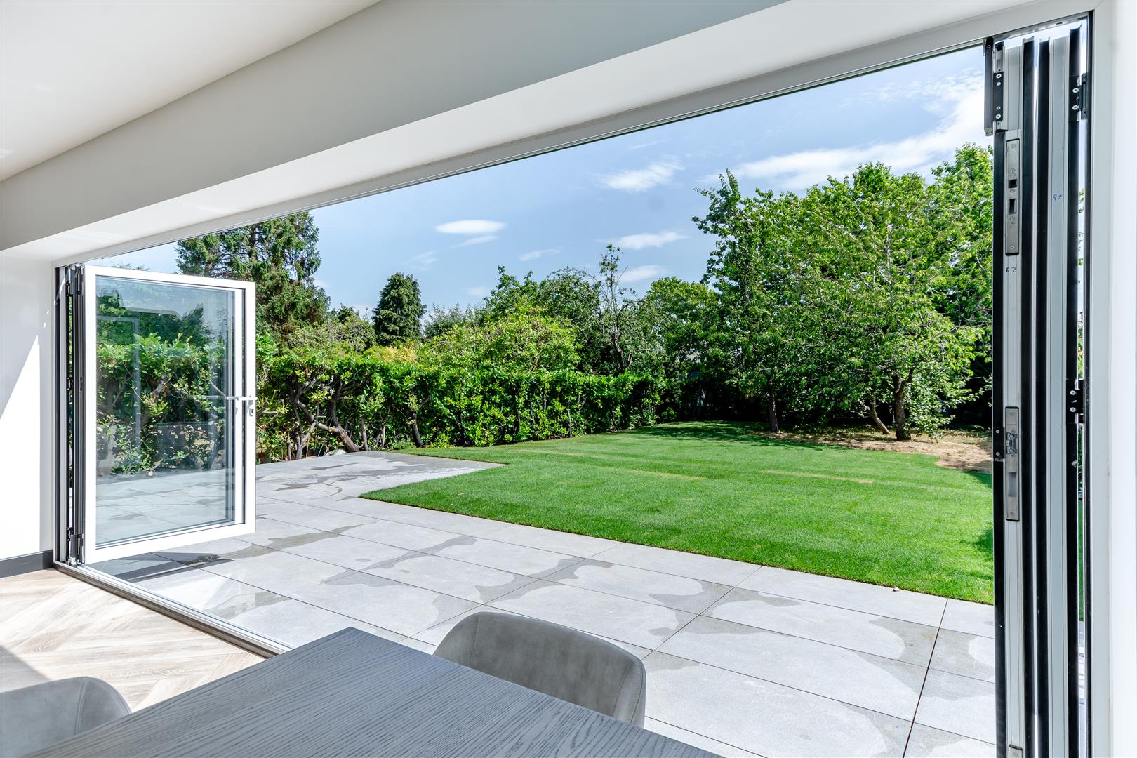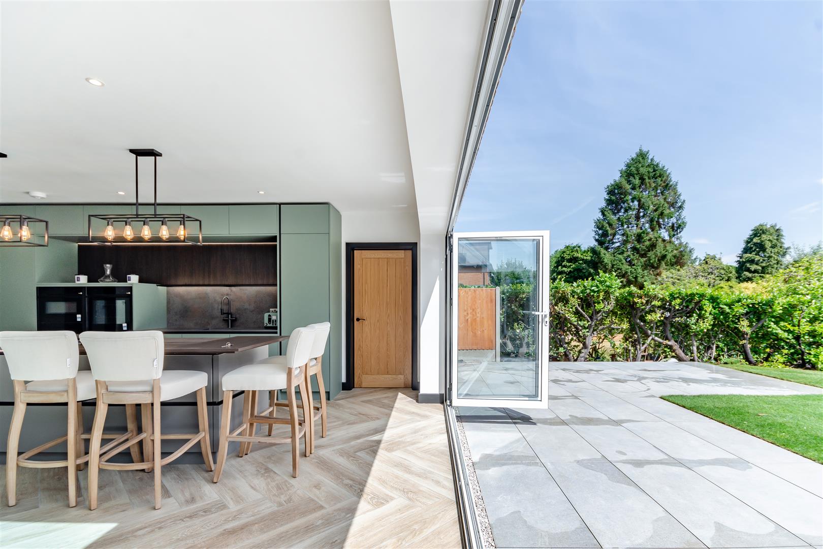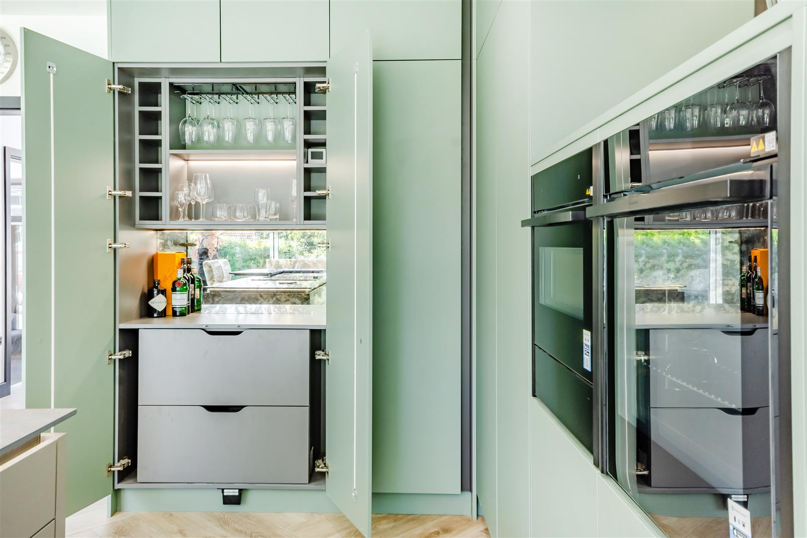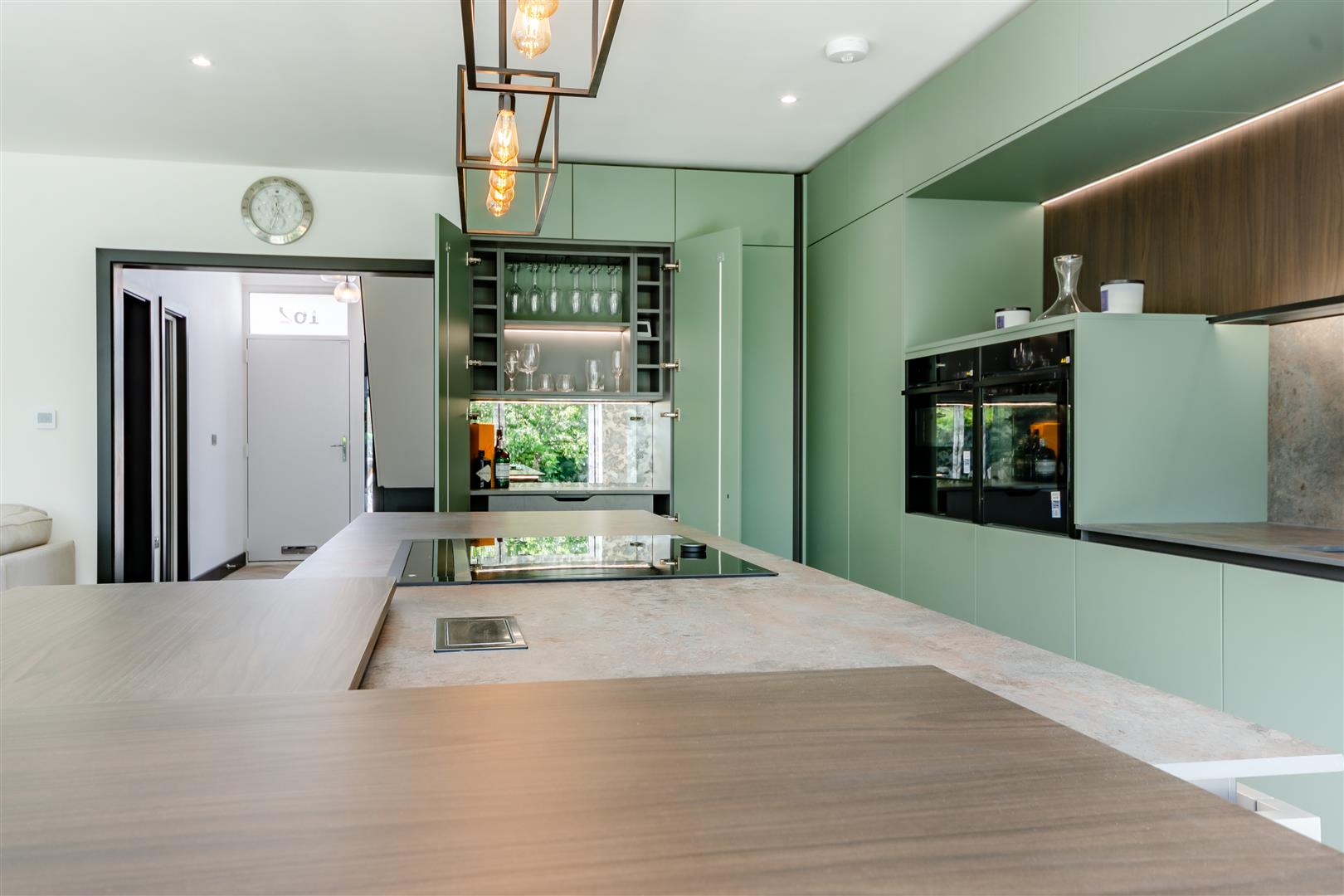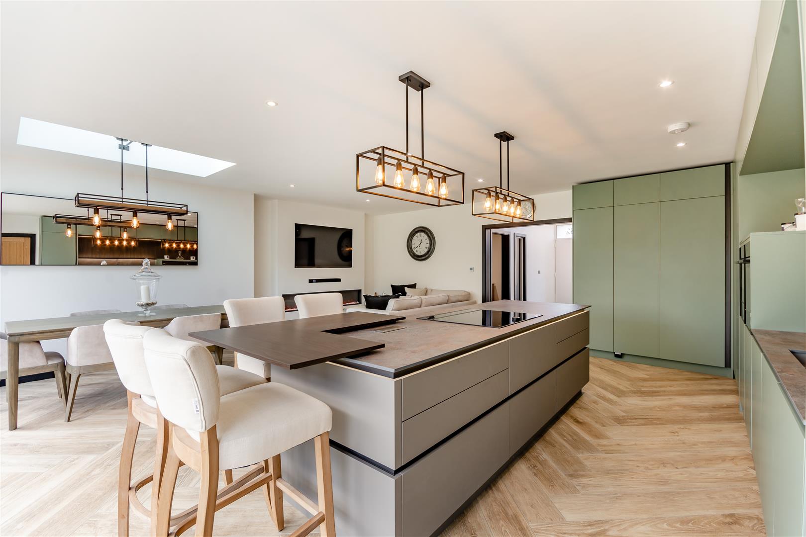 •Stunning, high-end kitchen in contemporary tones featuring integrated, premium Neff appliances: integrated dishwasher, built-in fridge and separate freezer, flex induction hob, glass draft extractor, pyrolytic oven with microwave, second oven with slide and hide door and warming drawer. The kitchen also has a breakfast bar, a separate bar area, LED feature lighting and a multifunctional, designer boiling water tap.