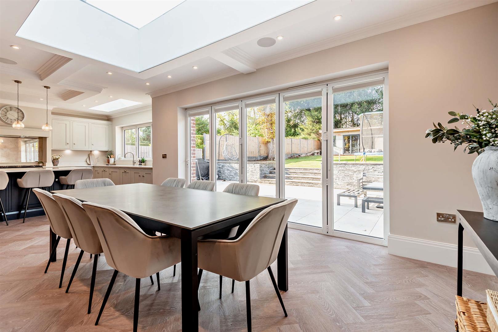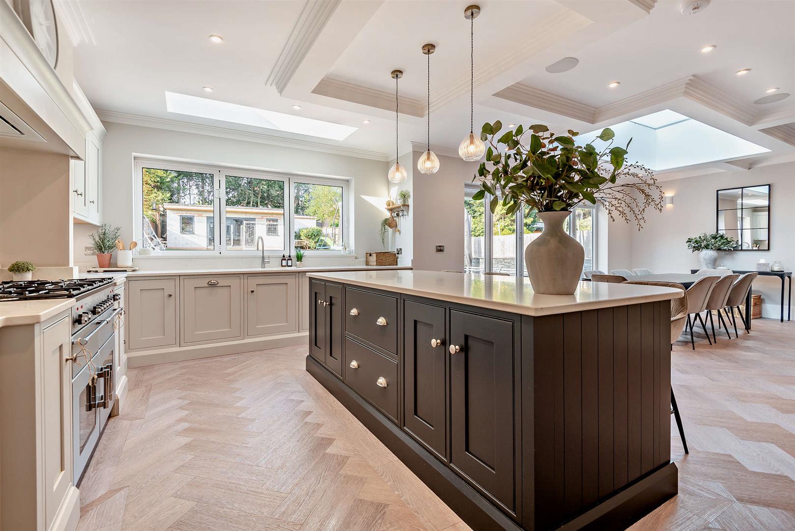 •Open plan Kitchen with window looking onto the rear garden, Herringbone flooring, integrated appliances which include two wine coolers, large cooker hob and extractor fan above, and central Island also family breakfast bar, and two large skylights, bi-folding doors opening onto the rear garden patio