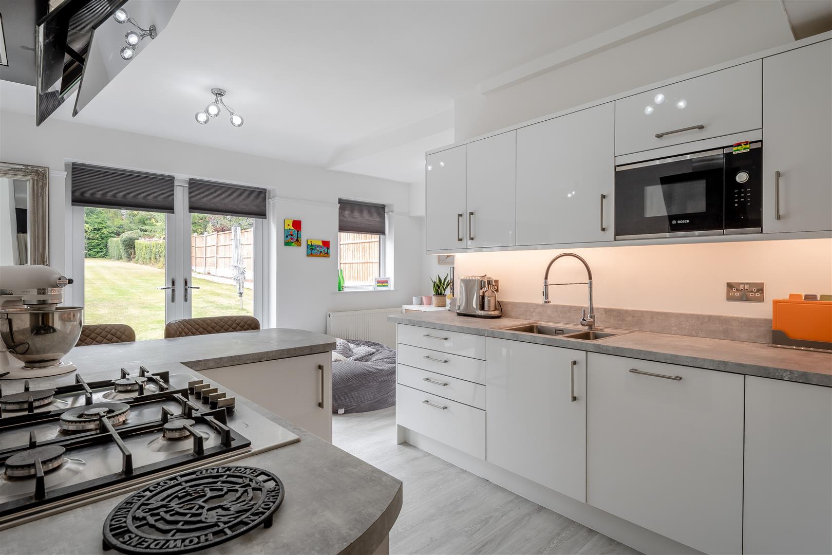 Open plan kitchen with integrated appliances, breakfast bar, pantry, French windows opening onto the garden patio
