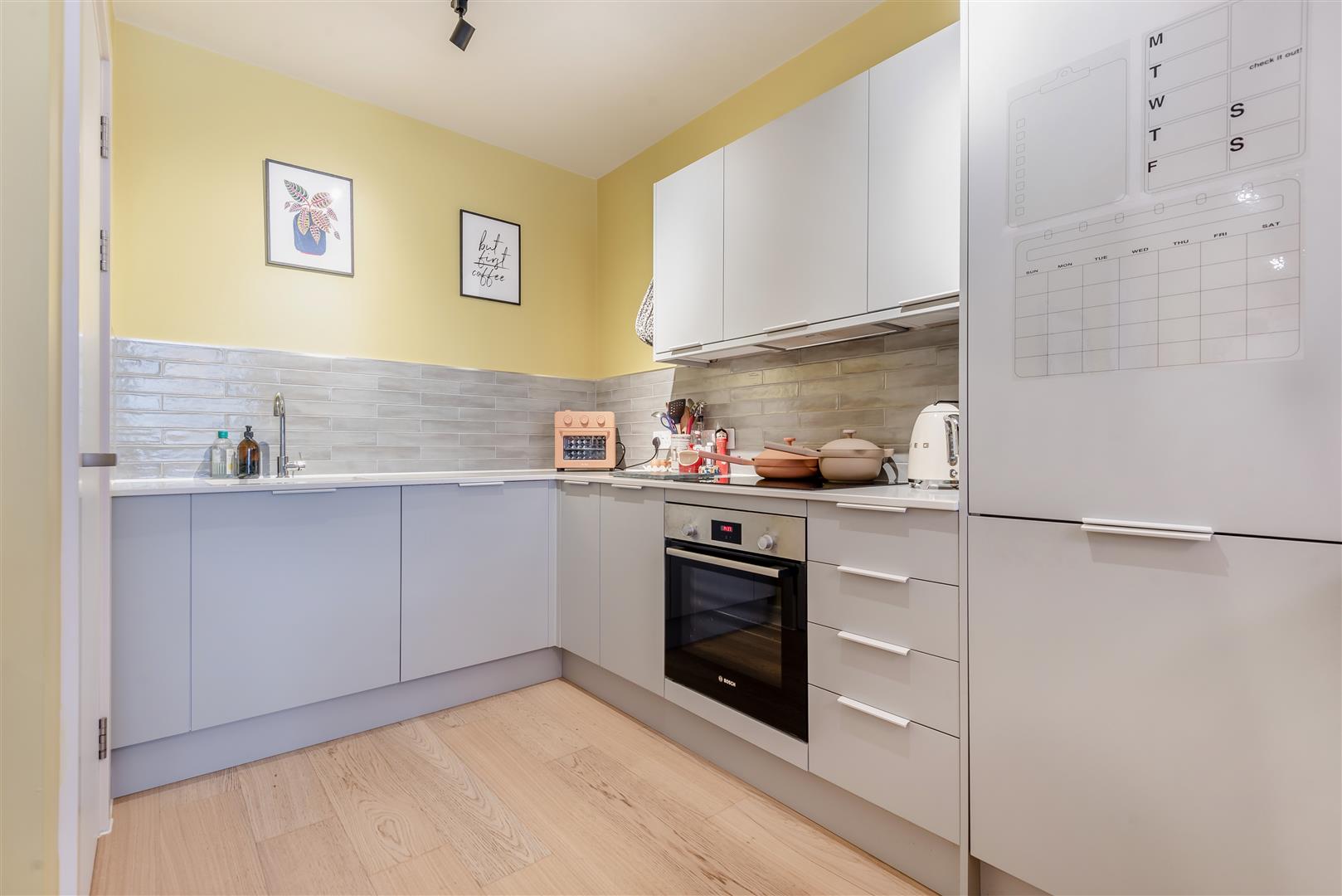 Open plan kitchen with integrated appliances, electric hob with extractor above and electric Oven