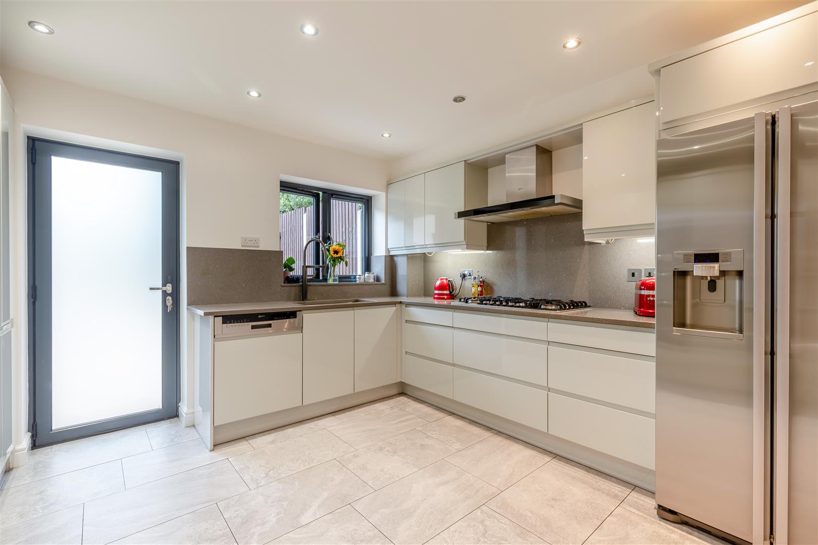 •Kitchen/ Breakfast / Living room with premium Porcelanosa tiles, a show kitchen having a large sky lantern, central Island with an integrated Siemens induction hob and motorised extractor fan. Additionally, the kitchen area benefits from fully integrated Siemens appliances, which include a steam oven, a conventional oven, a microwave oven, separate fridge freezer, and a bean to cup coffee machine with full bi-fold doors opening onto the rear garden patio allowing for alfresco dining.
