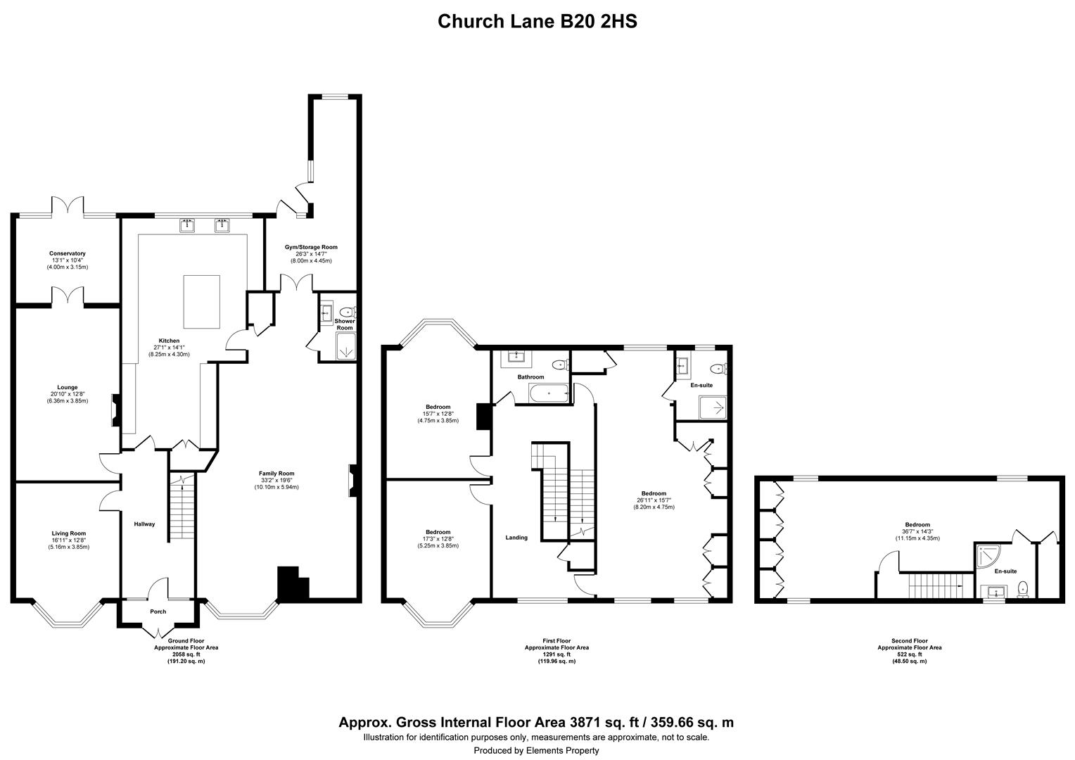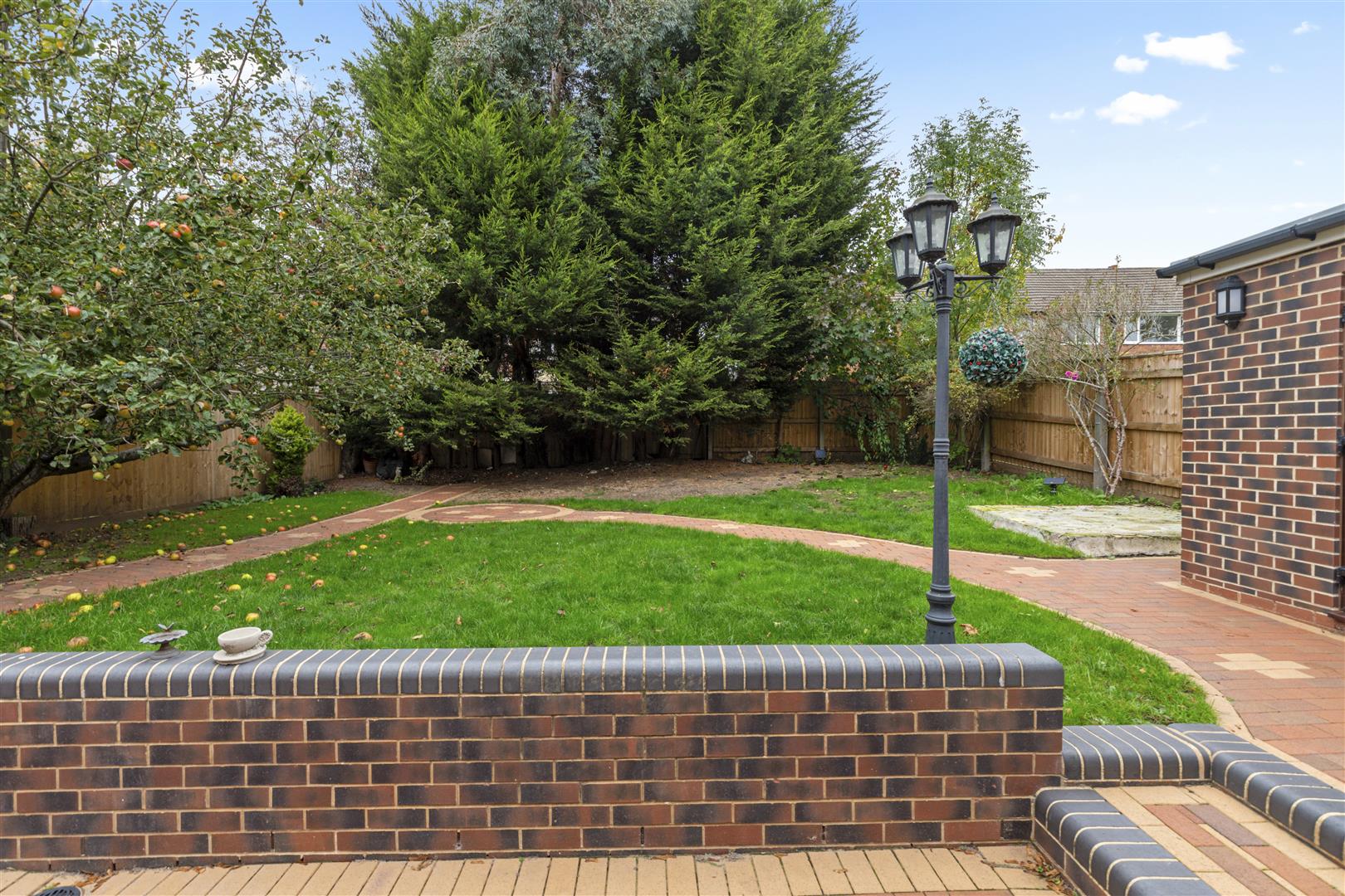 The property is approached via a tarmac driveway providing ample parking and features an enclosed porch with stained-glass windows leading into a welcoming reception hallway with wooden flooring. The ground floor offers a series of versatile living spaces, including a living room with a bow window and a lounge with a fireplace and double doors opening into a bright conservatory, which enjoys French doors leading to the rear patio. A further family room features a bow window, fireplace, and storage closet, complemented by a downstairs shower room. The open-plan kitchen forms the heart of the home, complete with a central island, pantry, extensive storage, and windows overlooking the garden. Adjoining this is a gymnasium or storage room with twin doors opening onto the rear patio. A staircase leads to the first floor, where the spacious landing gives access to the principal bedroom, which benefits from built-in wardrobes, an en suite shower room, and a storage closet. Bedroom two enjoys a bow window with garden views, alongside bedroom three and a stylish family bathroom finished with marble tiling. Stairs continue to the second floor, where bedroom four offers built-in wardrobes, an en suite shower room, and dual-aspect windows. Outside, the property boasts an enclosed rear garden with a patio, lawn, and mature trees, including an apple tree, together with Victorian-style triple-headed lamp posts, a garden path, and a gate.