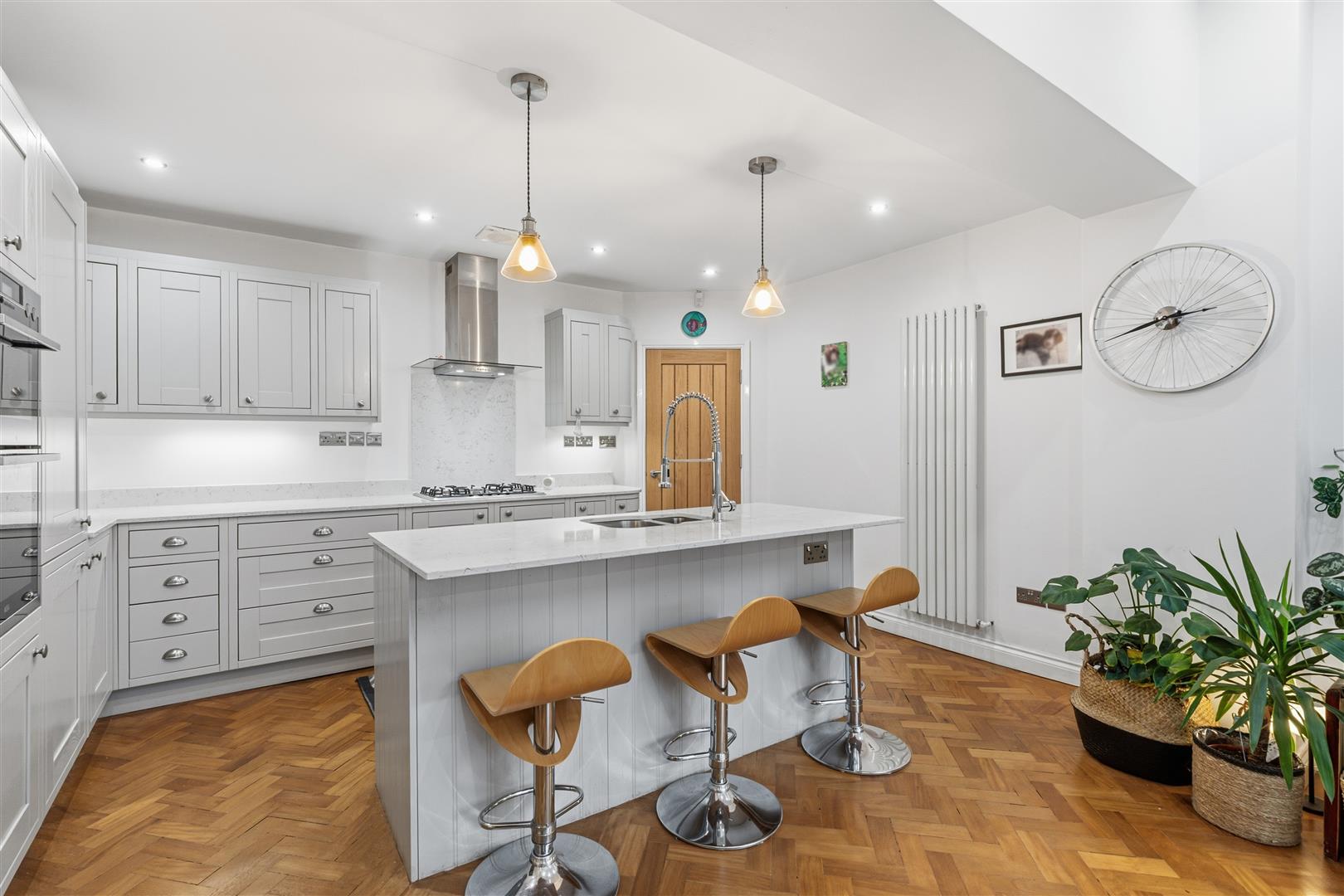 At its heart is an impressive open-plan kitchen, dining and family room with marble worktops, bespoke cabinetry, central island with inset sink, and seamless garden access, complemented by a utility room, guest WC and excellent storage.